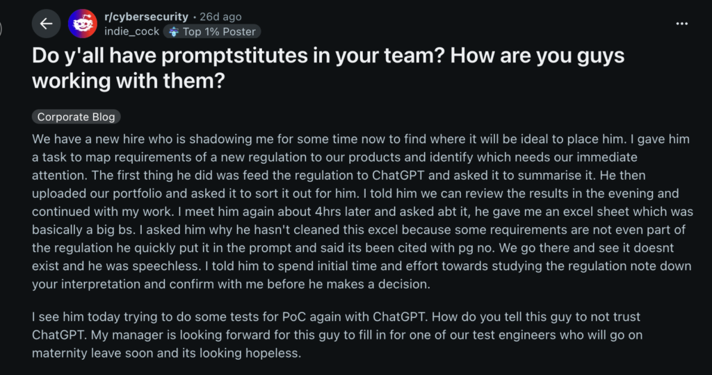 In the Reddit example, a new employee was being onboarded and tasked with mapping regulatory requirements to company products to determine what needed urgent attention. Instead of engaging with the material directly, the employee first fed the regulation into ChatGPT to summarise it. He then uploaded the company’s product portfolio and asked the AI to categorise it.