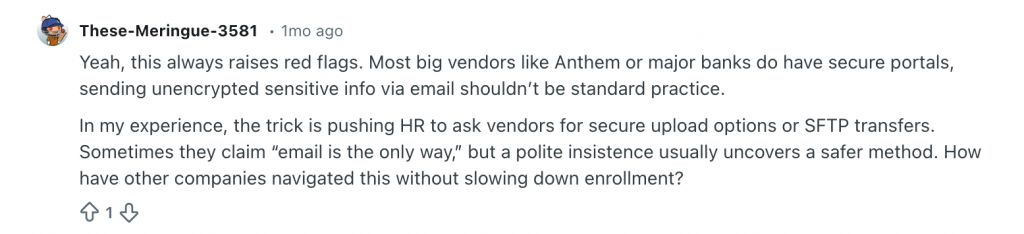 Several contributors to the discussion pointed out something that should not be controversial. Large insurers, banks, payroll providers, and benefits platforms already have secure ways to receive sensitive data so email is not the requirement, instead it’s the path of least resistance.
