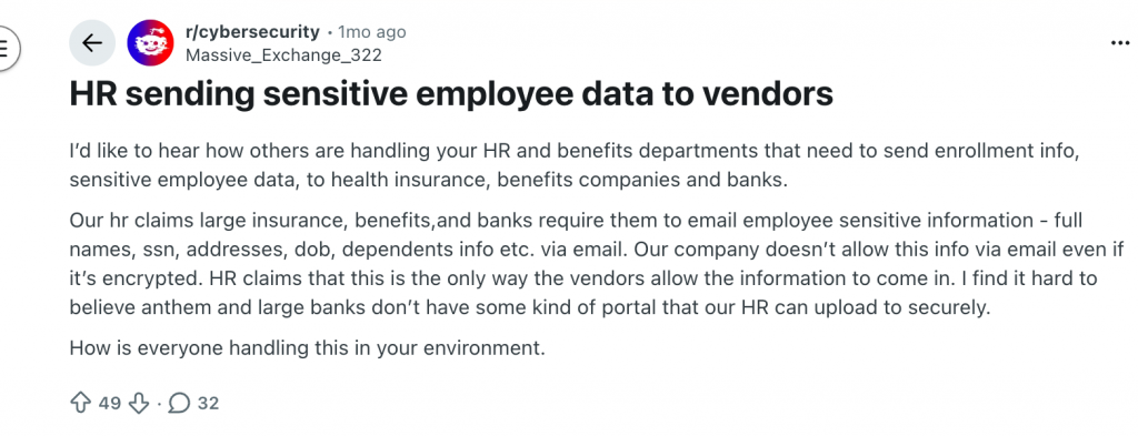 An HR team needed to send employee enrolment data to insurers, banks, and benefits providers. Full names, Social Security numbers, dates of birth, dependent details. Security blocked the transfer because policy clearly forbids sending this class of data by email, even if it’s encrypted. HR pushed back and said they had no choice, the vendors only accept the data by email.