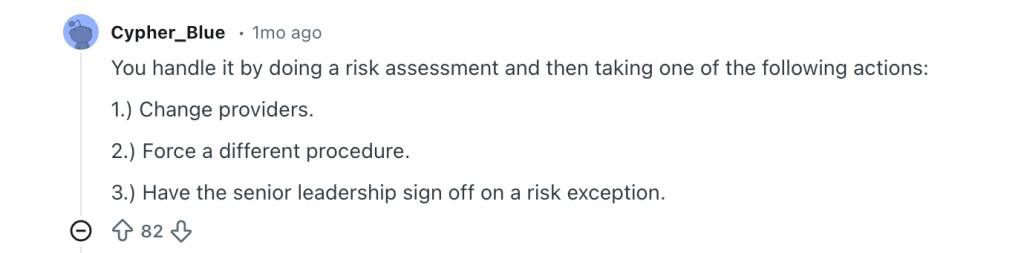 Someone stated that a good approach is to assess the risk, force a different procedure and have senior leadership sign off on a risk exception if they feel otherwise. Without adopting any of these approaches, anything else is silent acceptance, and silent acceptance is still acceptance.